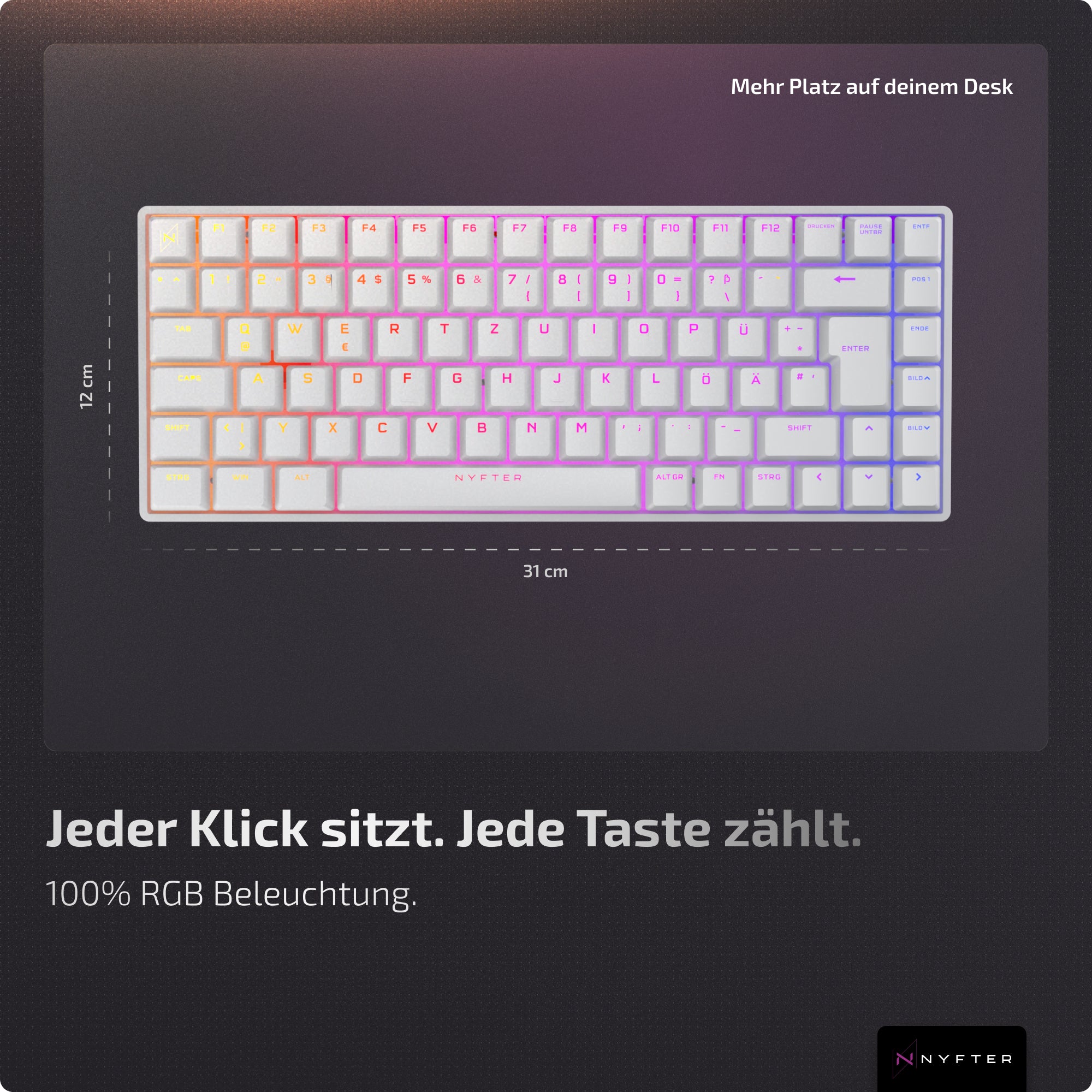 Click feeling, sound, processing. The Nyfboard impresses with pre-lubricated switches and stabilizers & double damping. Small details that can be felt with every keystroke.
