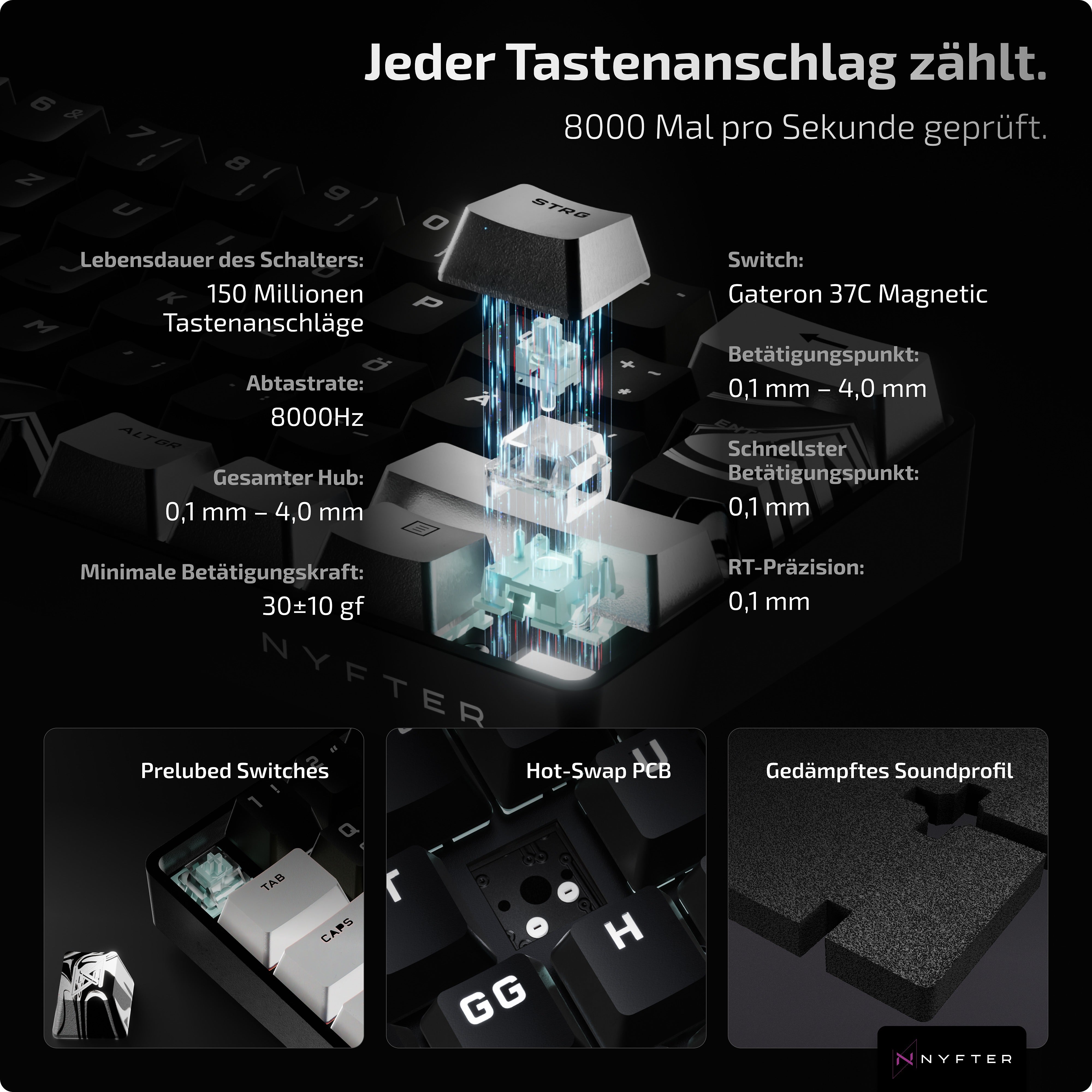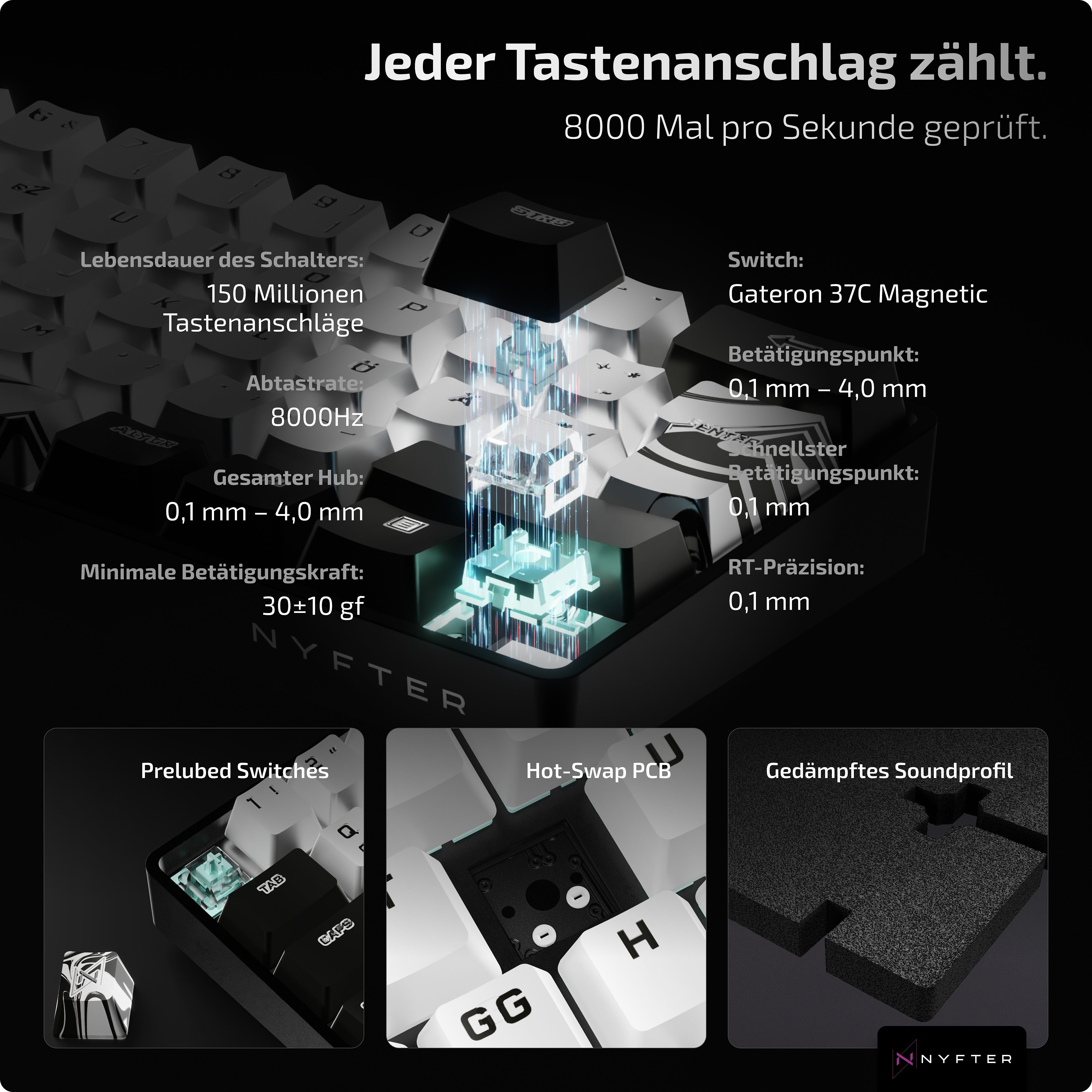 The actuation point can be adjusted to your needs in 0.1mm increments. The Gateron KS-37c magnetic switches offer a pleasant, linear feel with a pressure point of 30gf. Pre-lubricated and satisfying in sound and feel, they have another advantage: Magnetic switches minimize wear and tear and can withstand up to 150,000,000 keystrokes.
