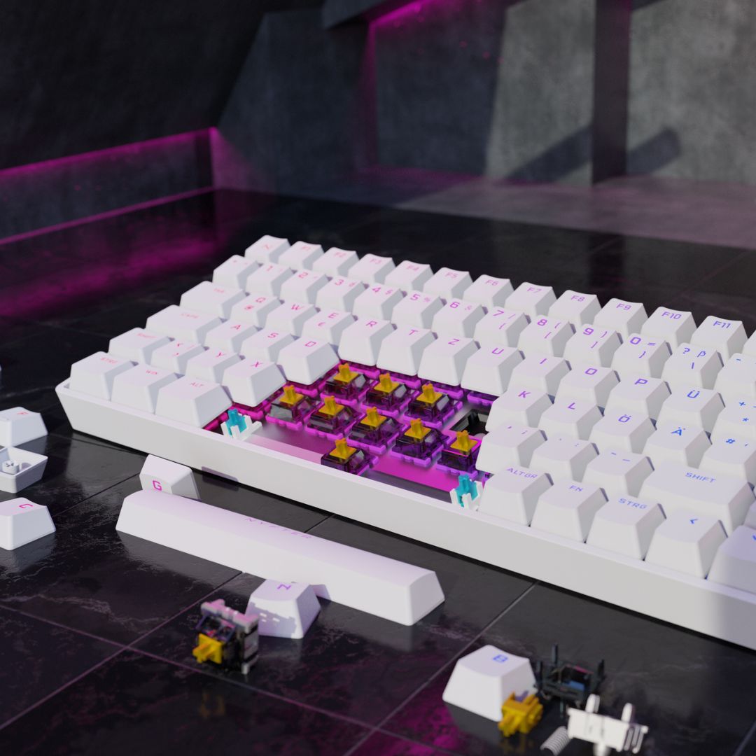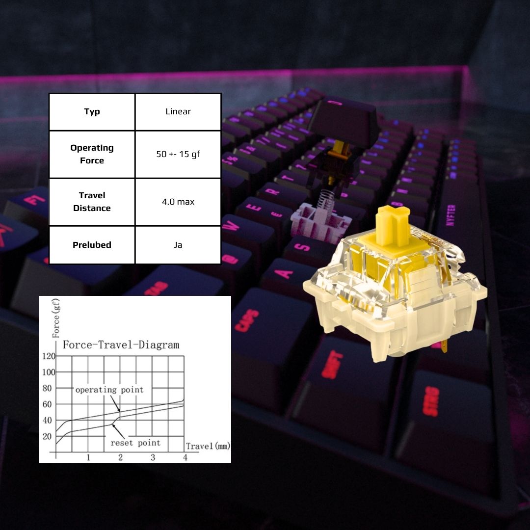 Ici aussi, nous avons choisi la prochaine génération. Avec le Gateron Yellow GPro 2.0, nous misons sur des commutateurs linéaires pré-lubrifiés et optimisons ainsi l'acoustique et le toucher.