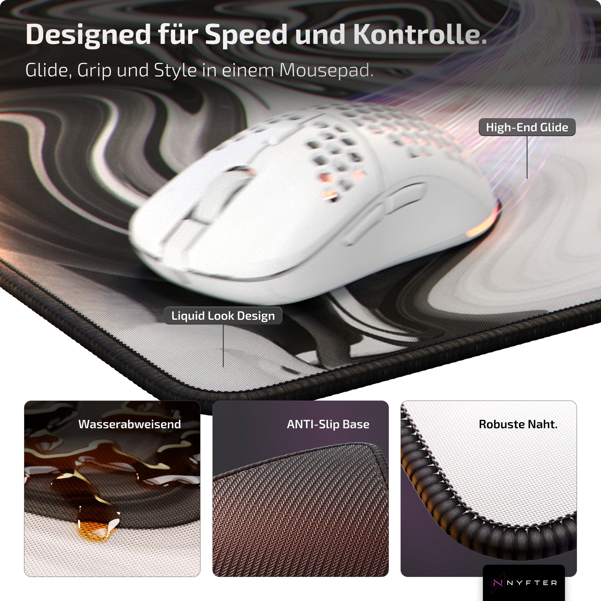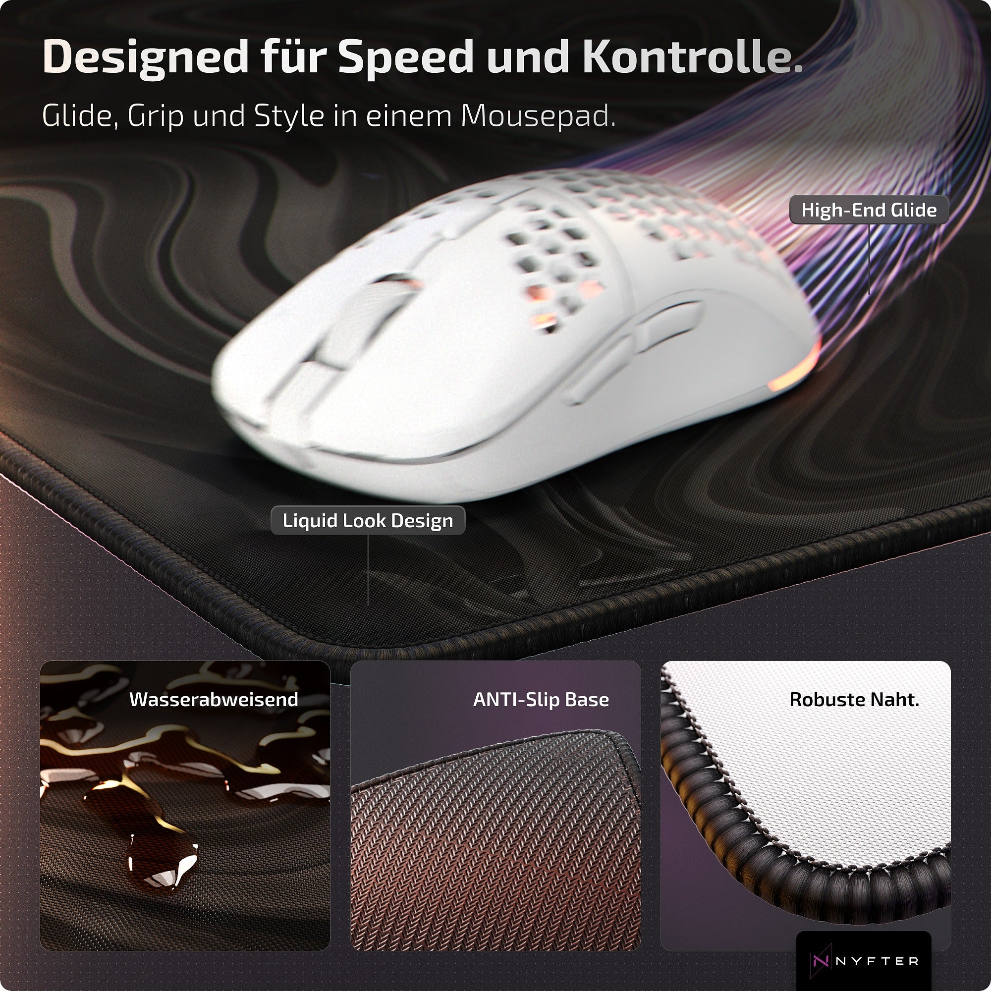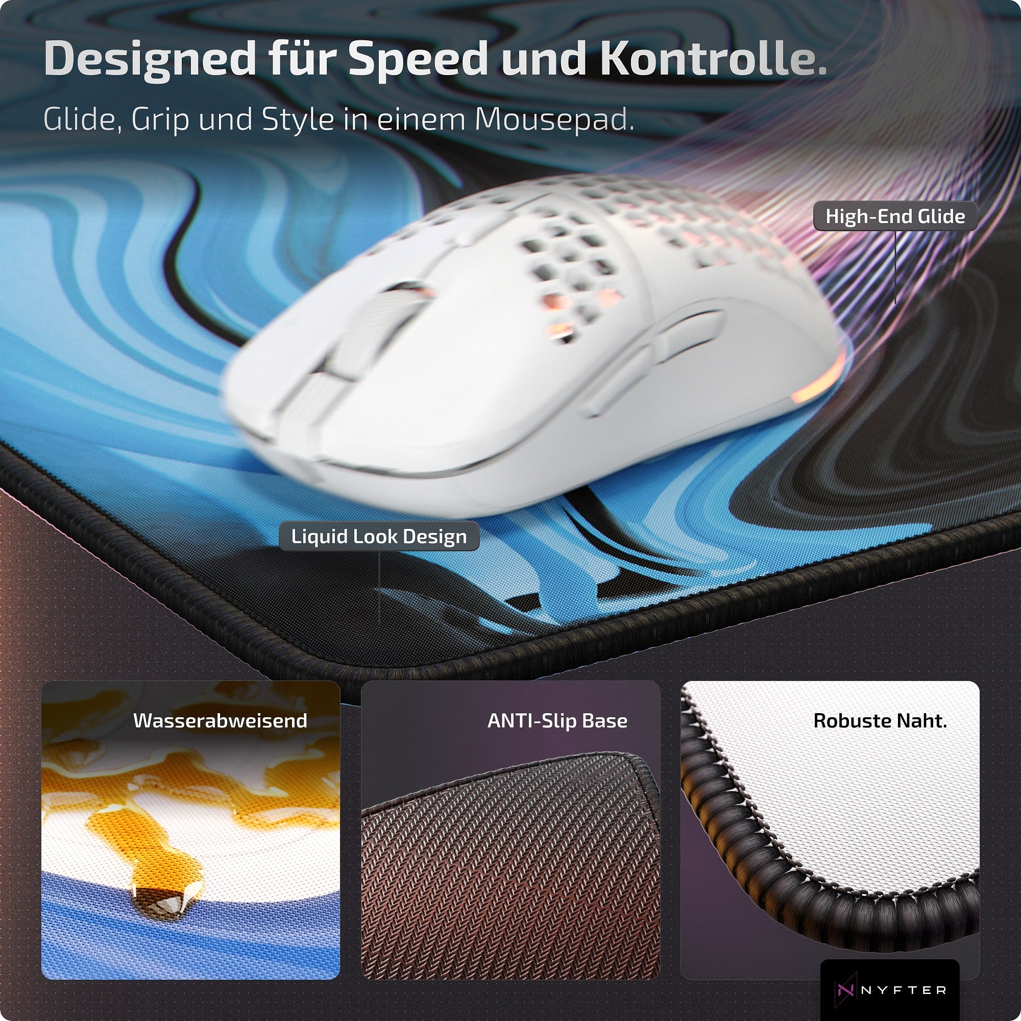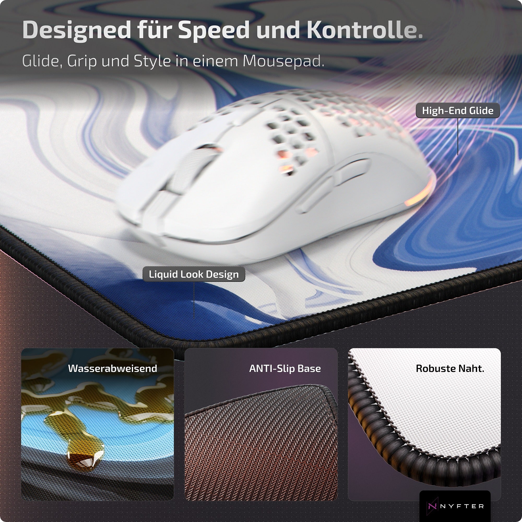 - Das Nyfpad XXL Liquid Premium Gaming Mousepad bietet eine High-End Beschichtung, die ein schnelles Gleiten der Maus ermöglicht und gleichzeitig wasserresistent ist.