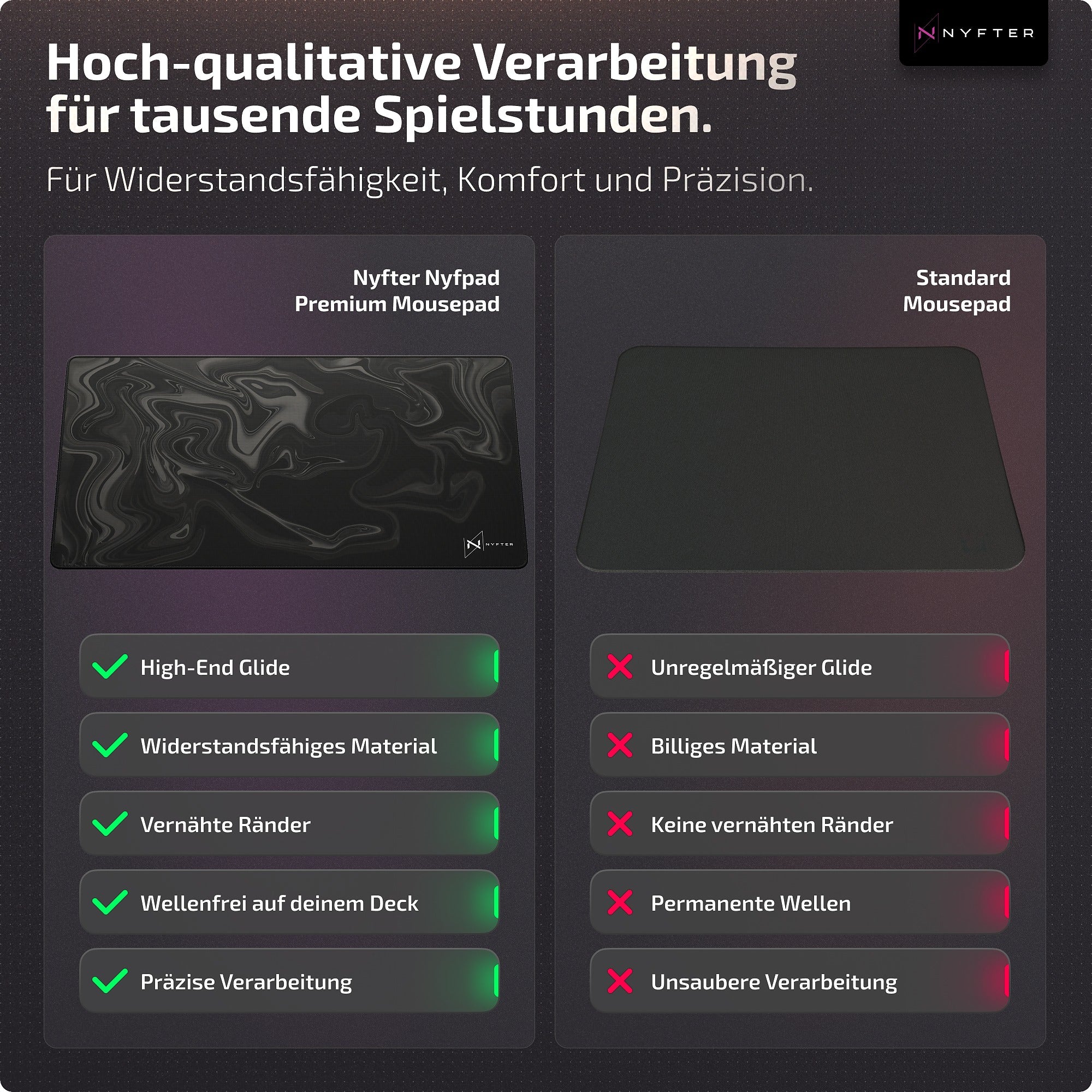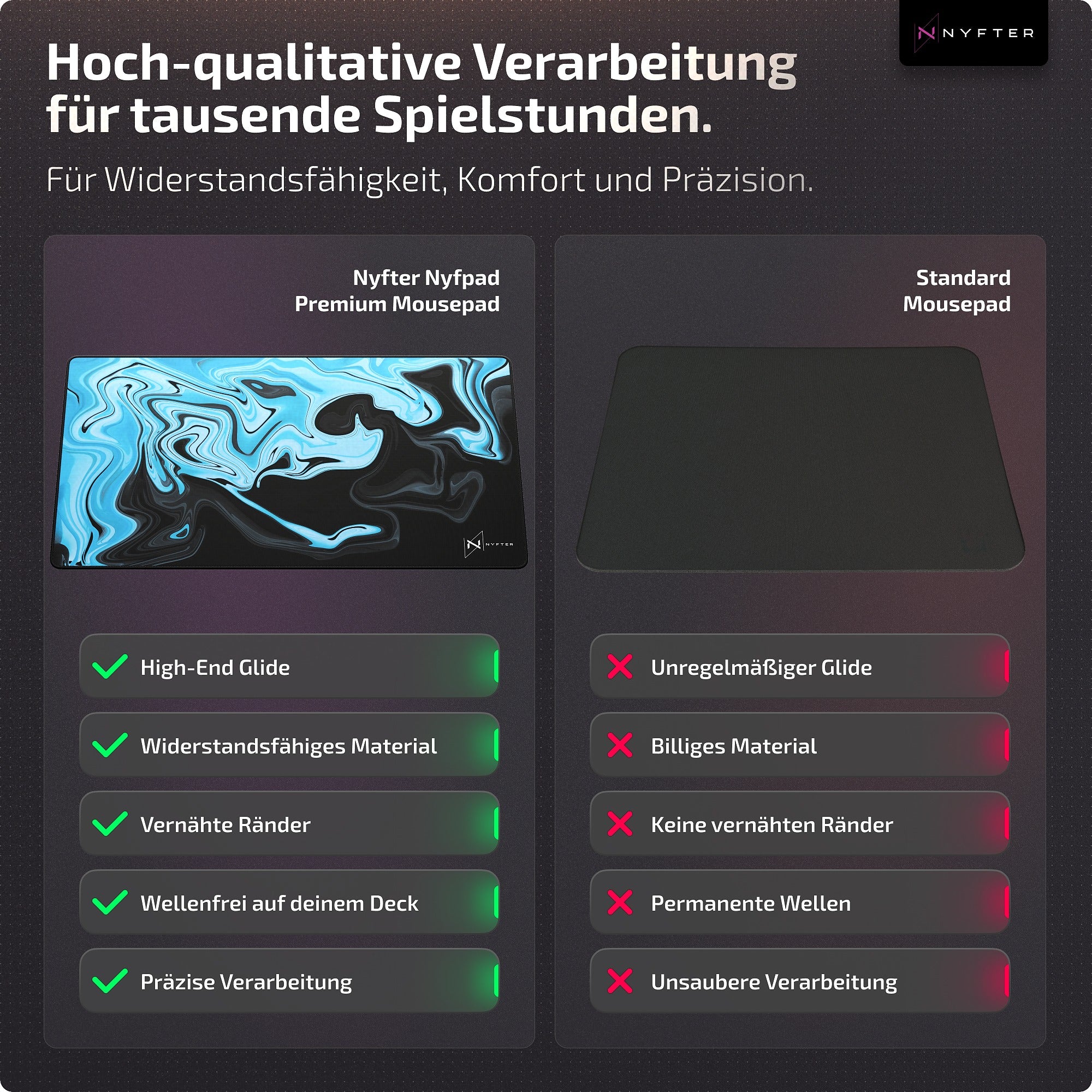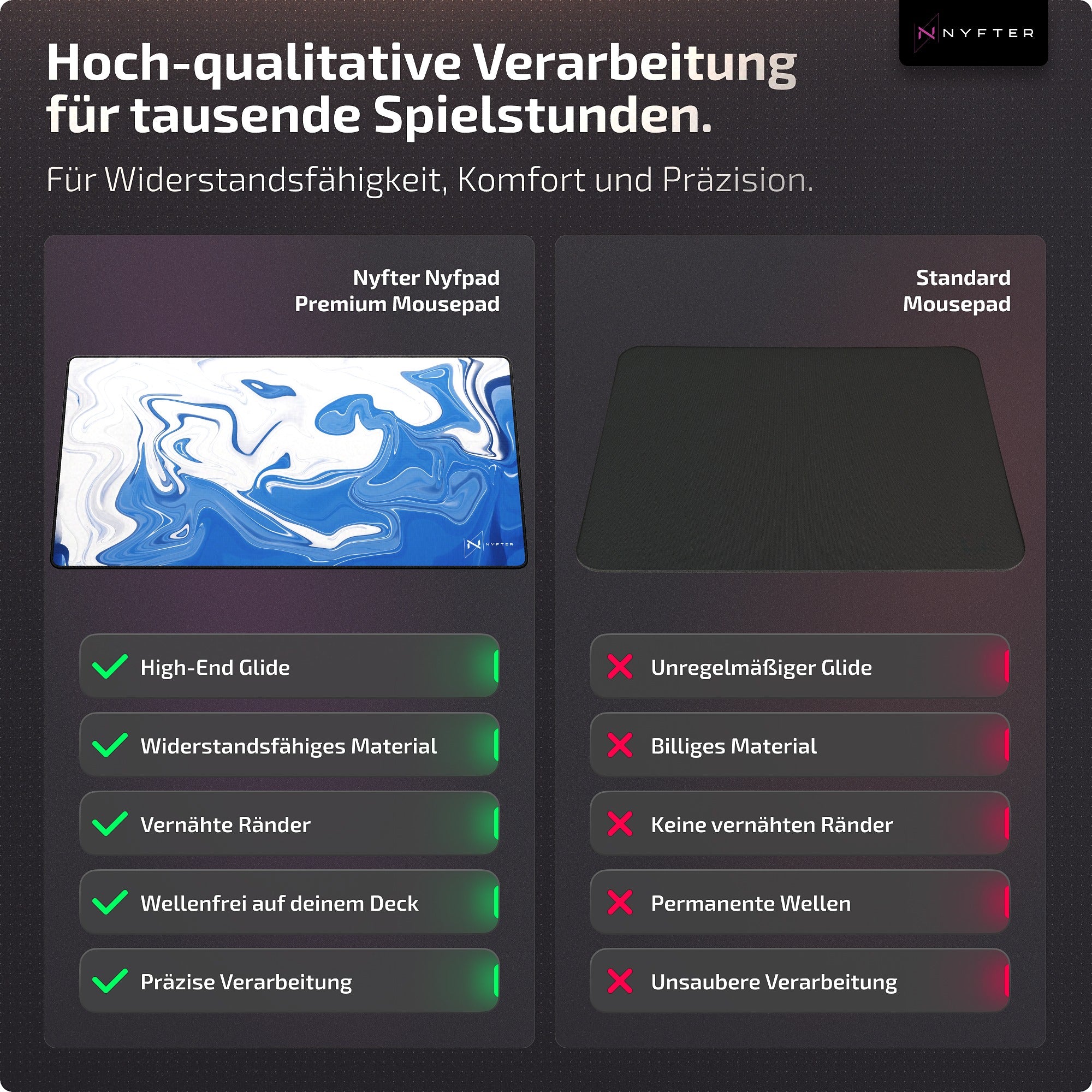 - Das Nyfpad XXL Liquid Premium Gaming Mousepad bietet eine High-End Beschichtung, die ein schnelles Gleiten der Maus ermöglicht und gleichzeitig wasserresistent ist.