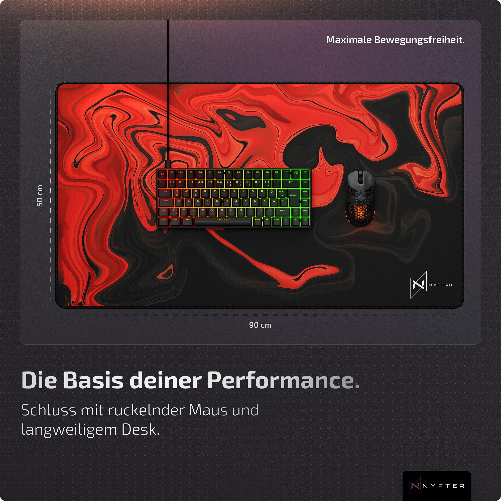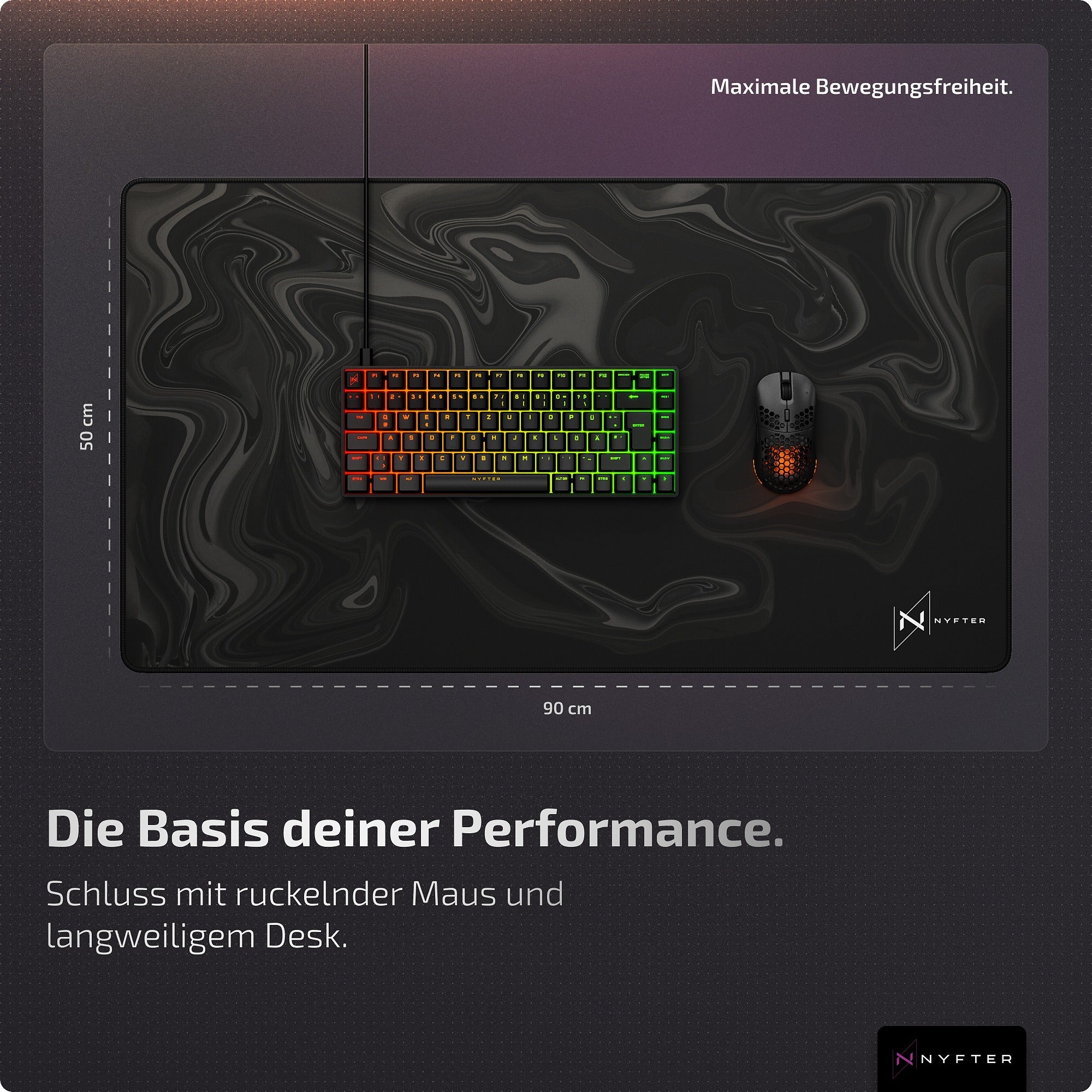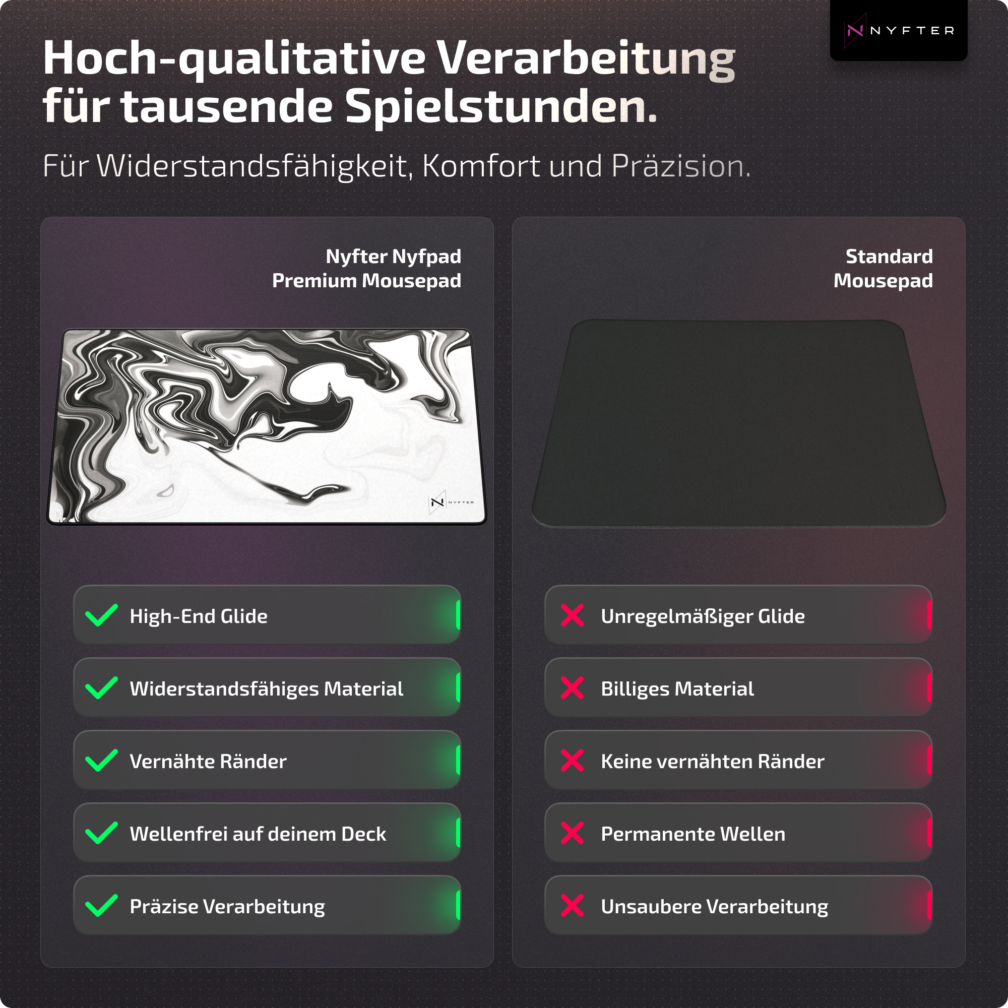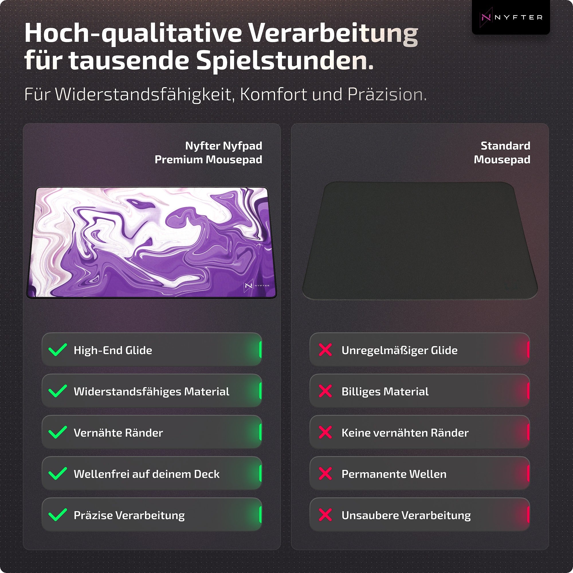 - Das Nyfpad XXL Liquid Premium Gaming Mousepad bietet eine High-End Beschichtung, die ein schnelles Gleiten der Maus ermöglicht und gleichzeitig wasserresistent ist.